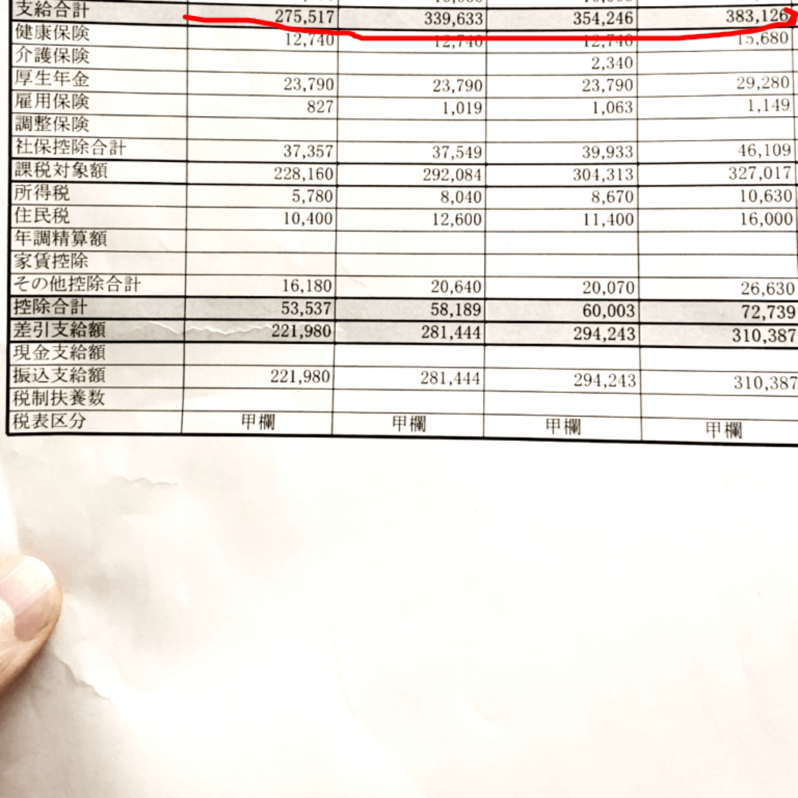 実際にお支払いしている給与明細となります。4名とも正社員の明細です。